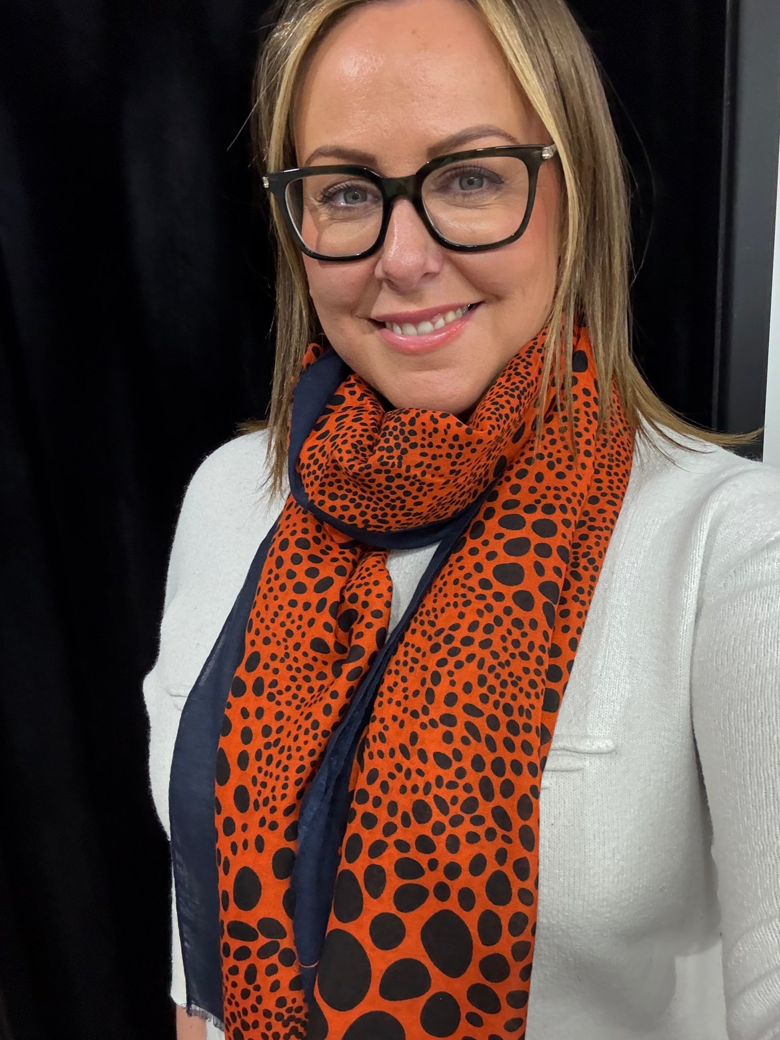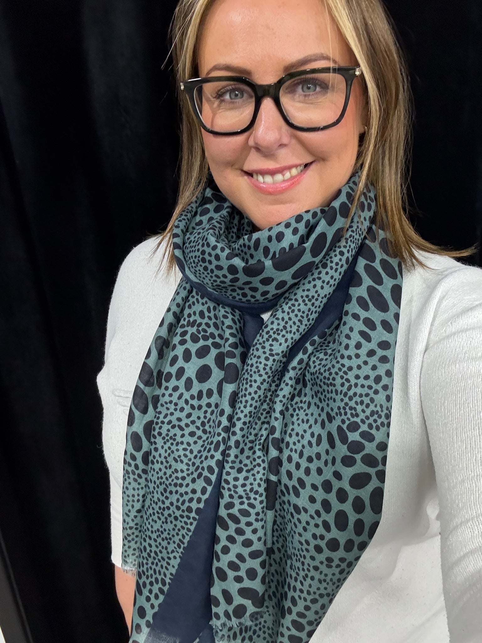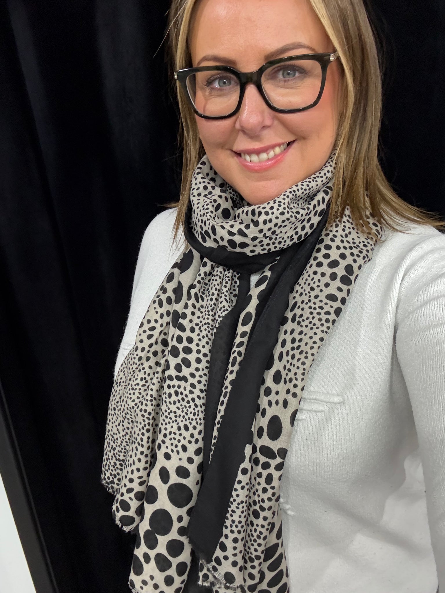 Gorgeous new lightweight scarf with circle print detail and colour block edge.