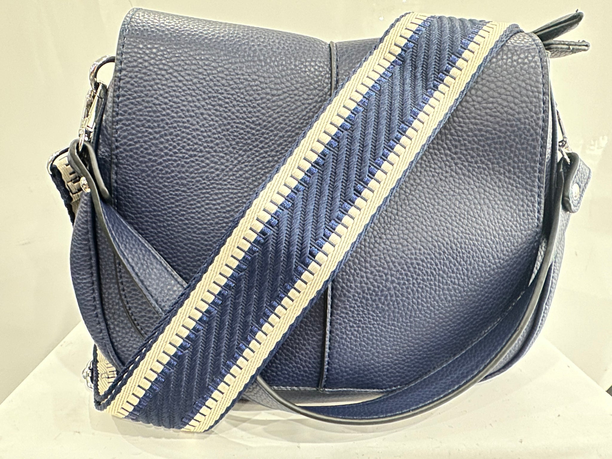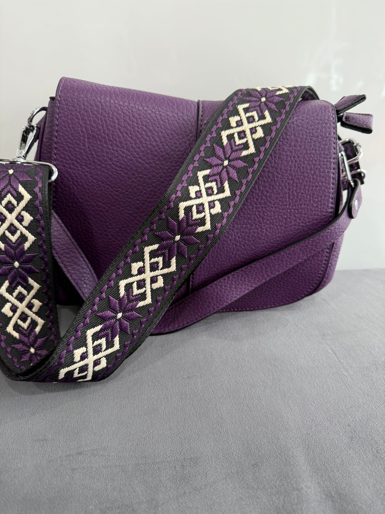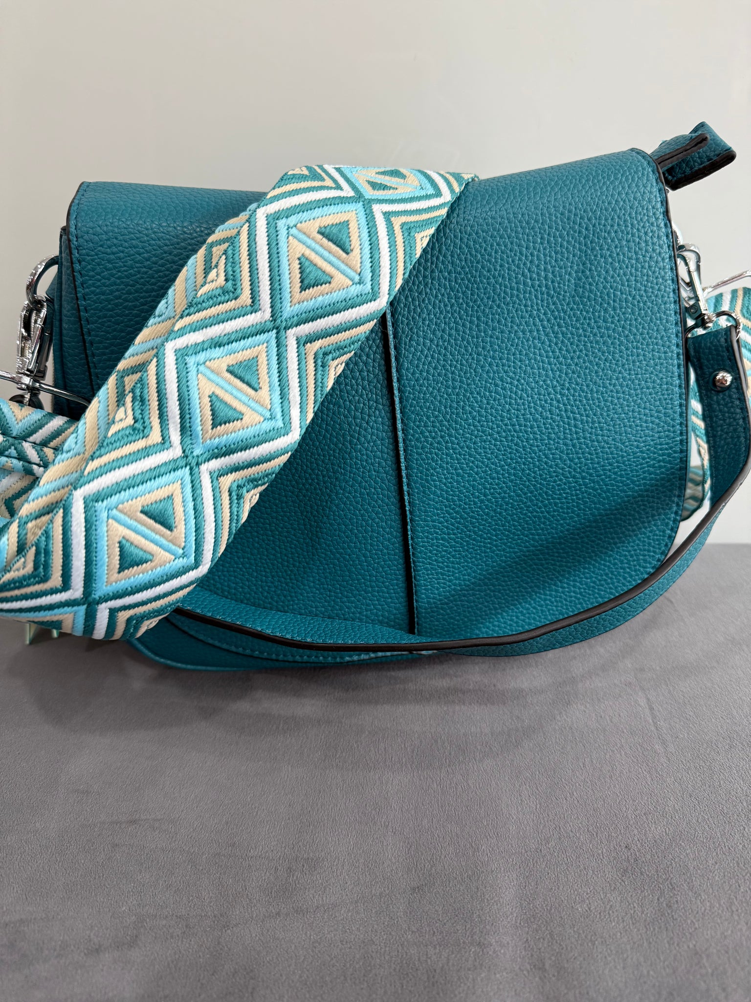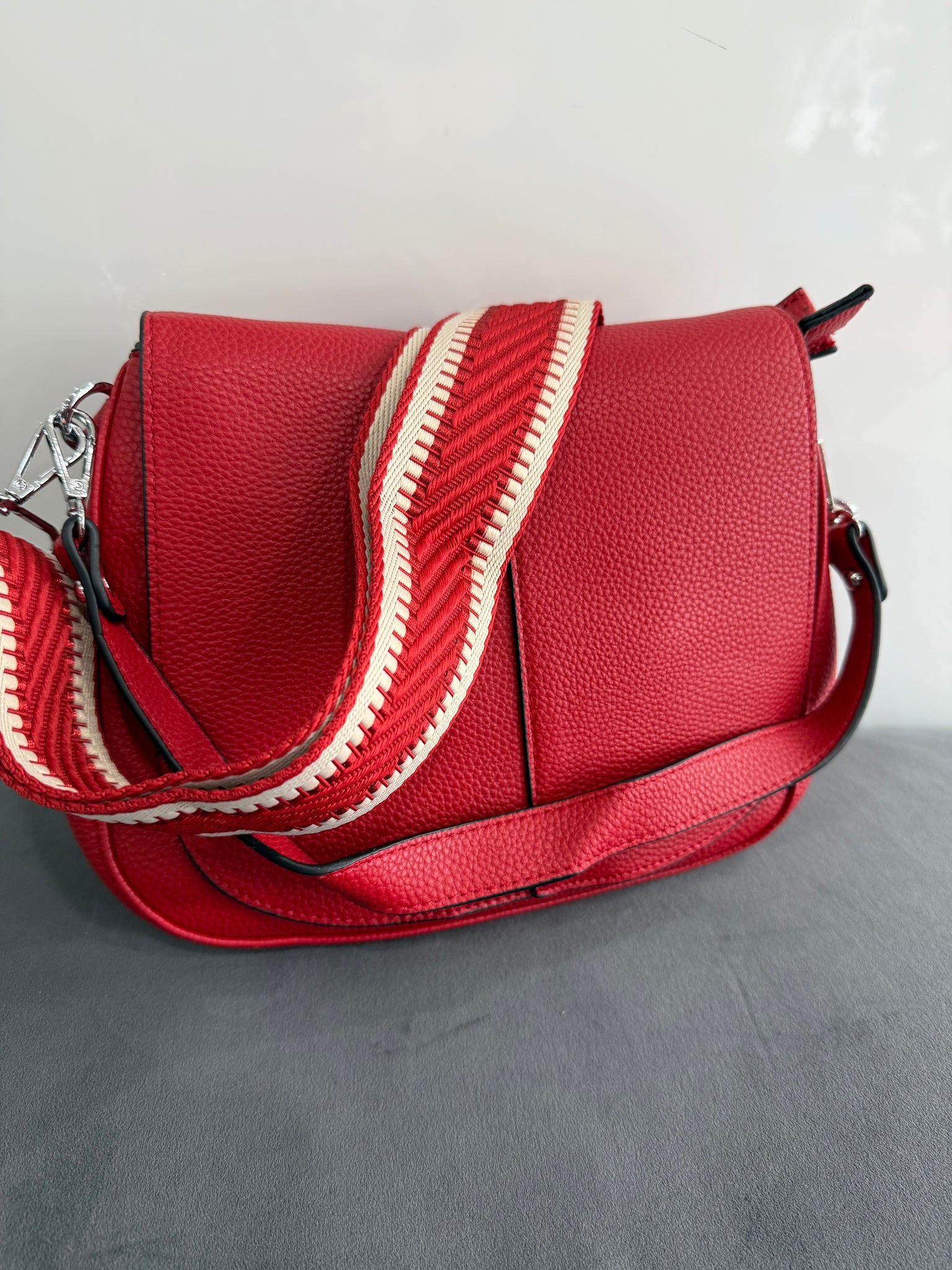 A stunning soft faux leather hobo style bag that comes with both a matching shorter strap (great on the shoulder or to hold in your hand) and a co-ordinating long wide fabric bag strap included in the price (so it can be worn crossbody). Soft and tactile to touch. It is not only stylish, but also convenient as underneath the flap it features 2 zipped compartments with an additional zip on the back to keep all your belongings safe. Available in various colours.