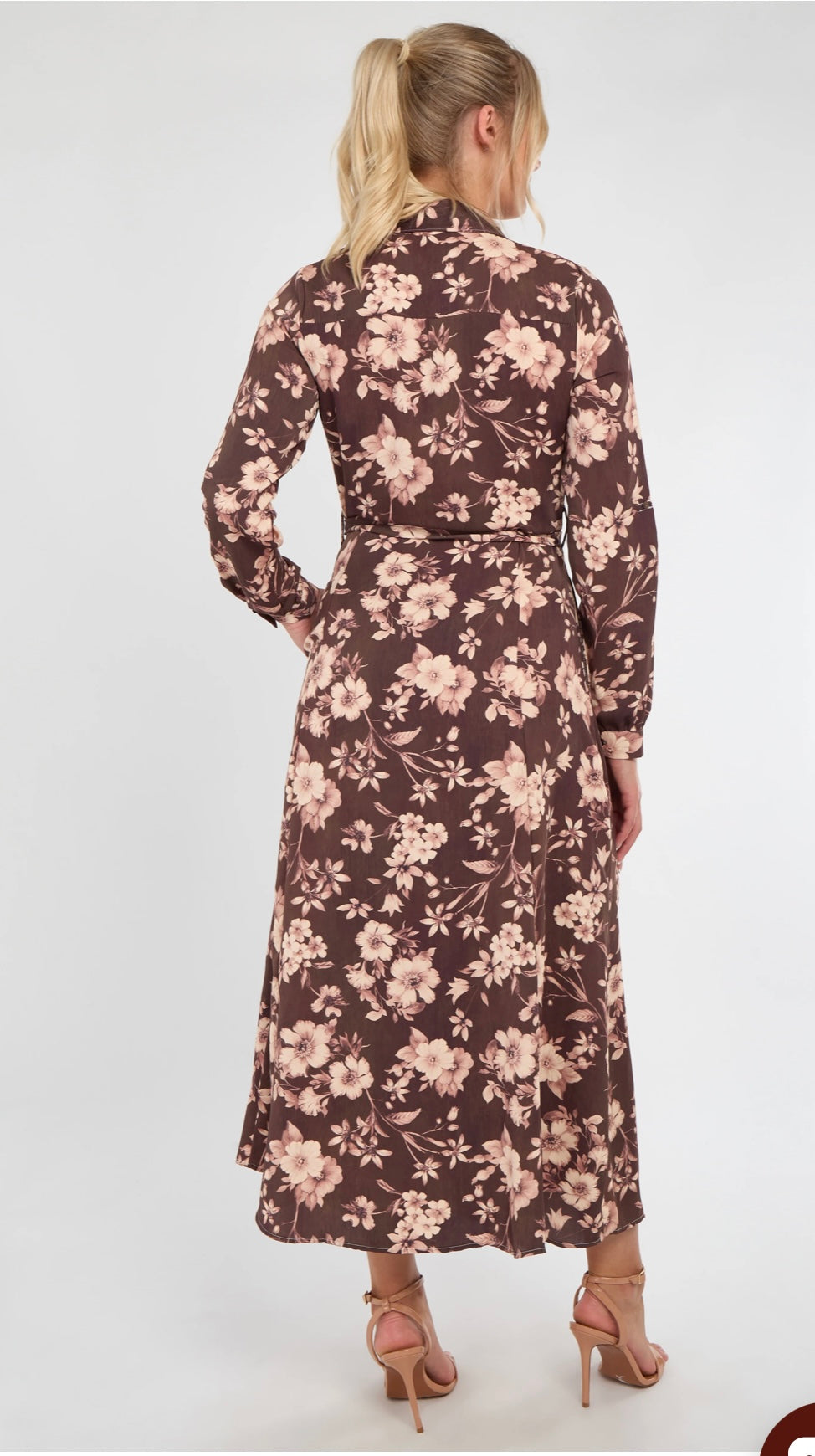This lovely shirt dress from Love Sunshine is perfect for the upcoming season. Stunning chocolate and blush pattern. It has a collar neckline with buttons going down the dress. It has cuffed long sleeves which are so flattering and they can be rolled up and fastened up. It has pockets and is true to size.