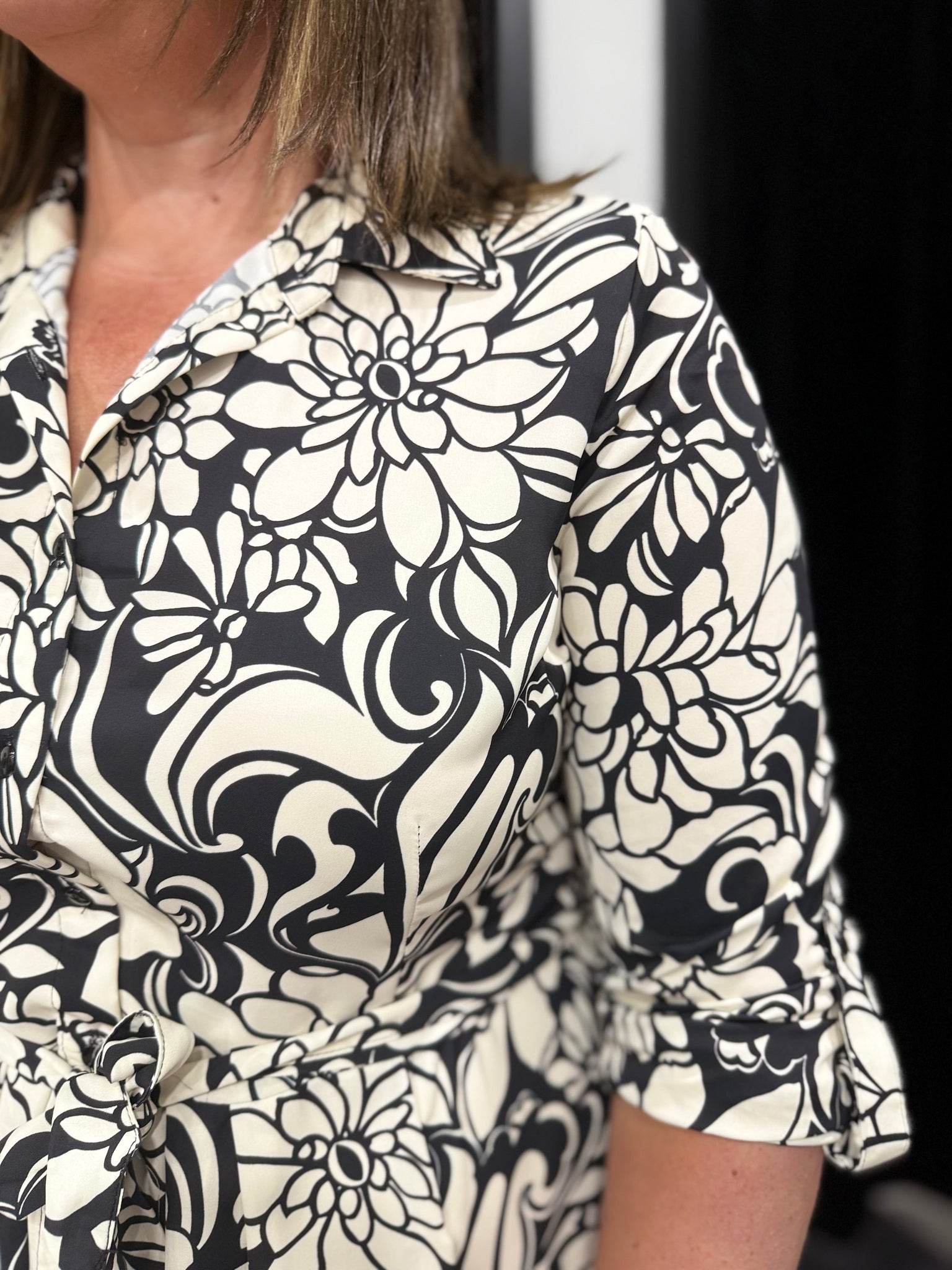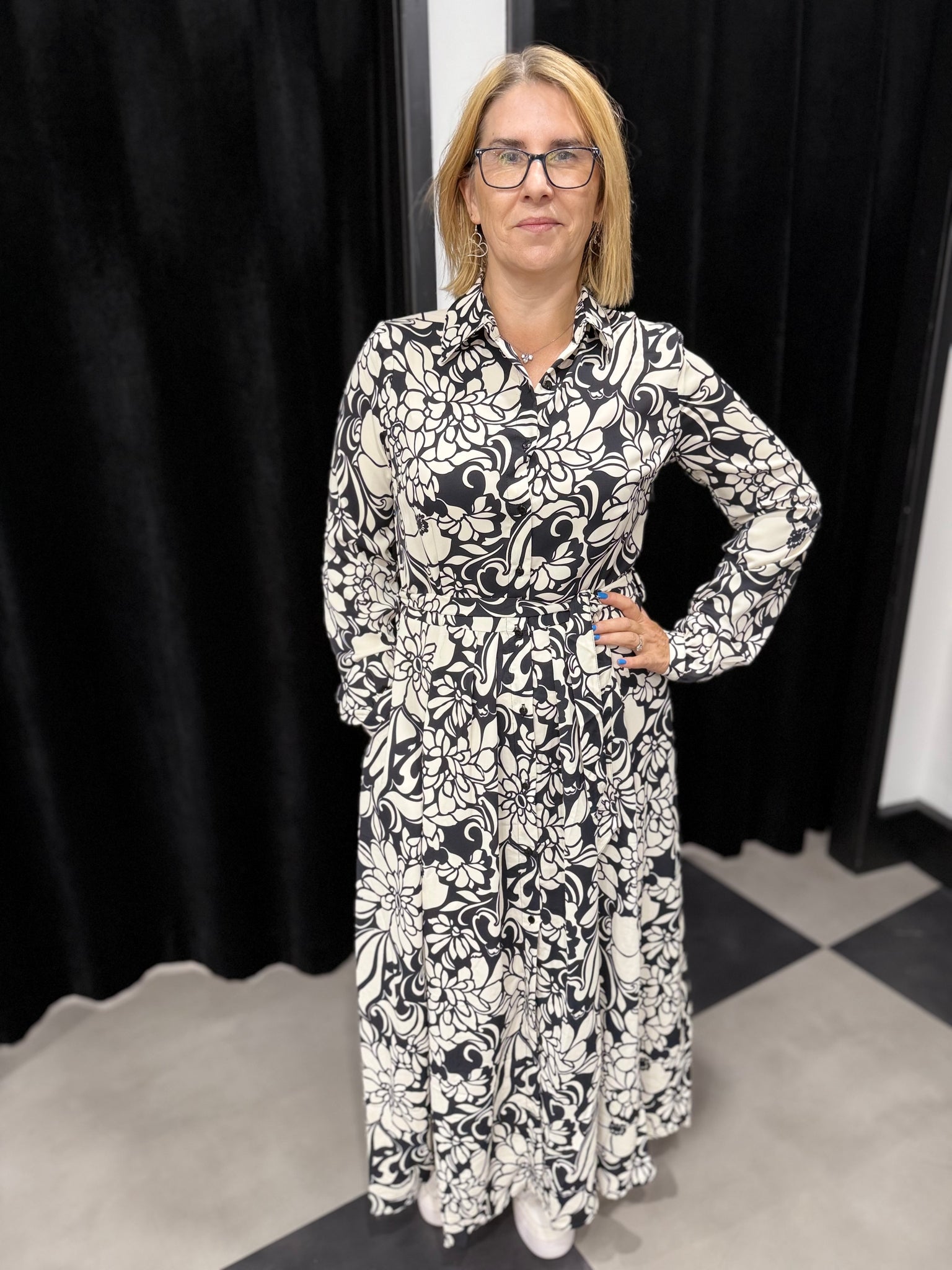 This is a flattering Maxi Shirt Dress from one of our favourite brands, Love Sunshine. This one comes in a fabulous black & white floral print.