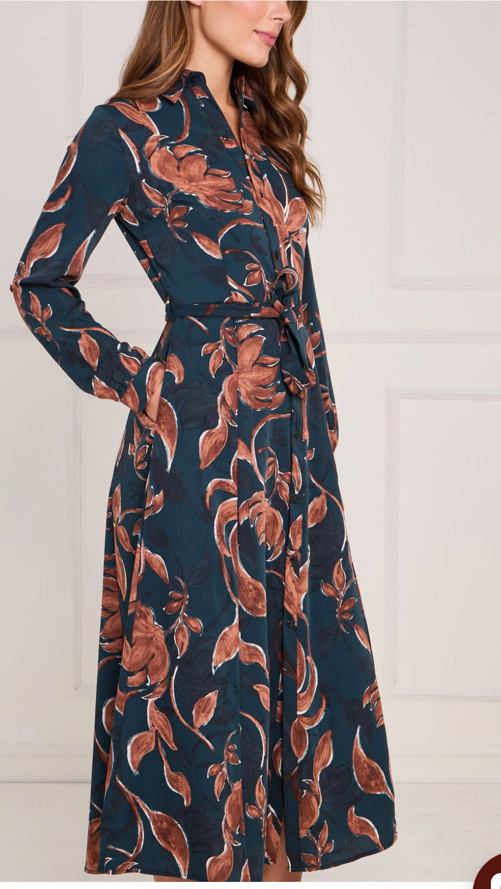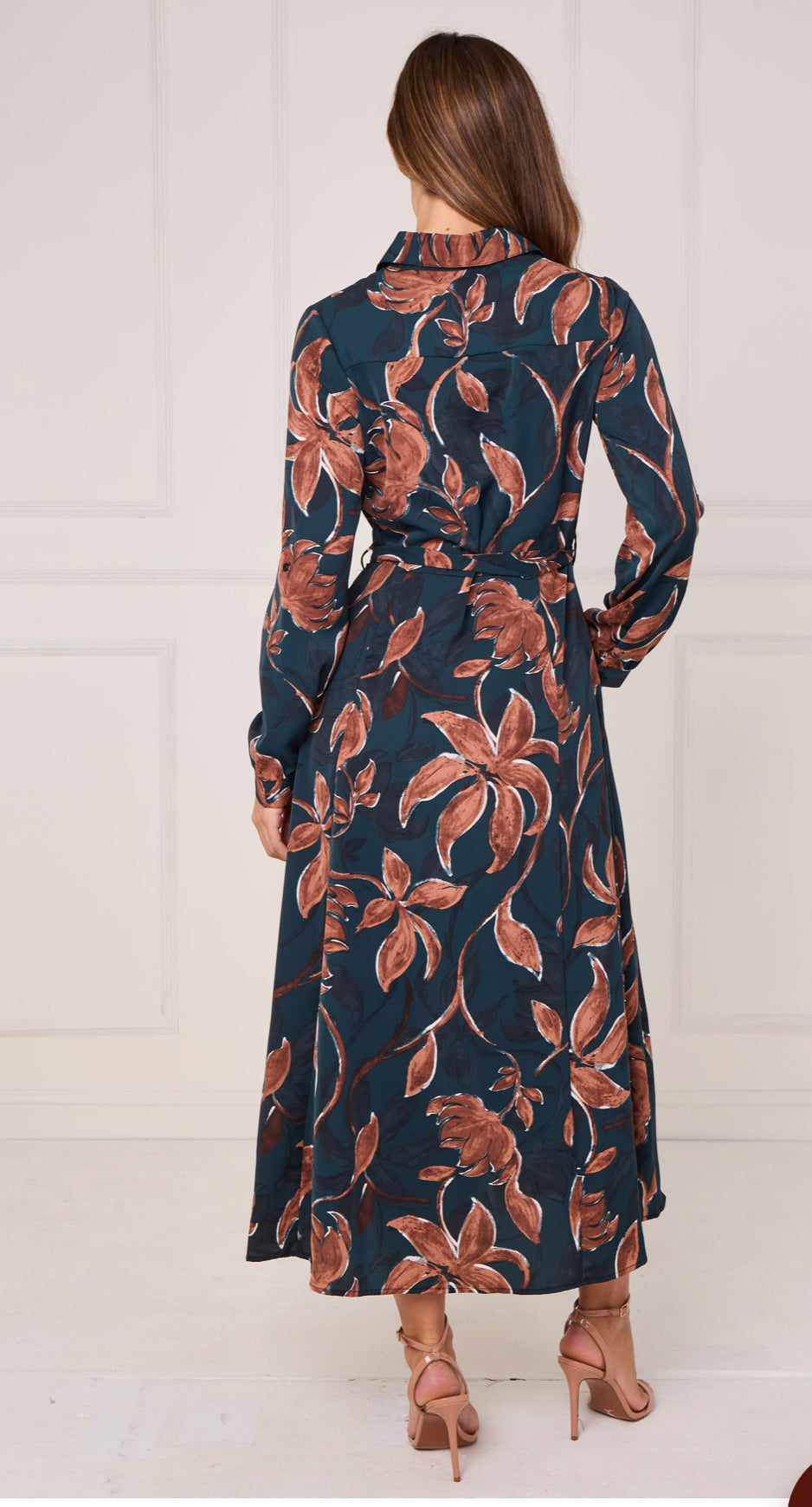 Elevate your autumn style with this beautiful Teal and Chestnut Botanical Floral Print Maxi Shirt Dress from Love Sunshine. Crafted from soft, flowing fabric, it features a button-through front, adjustable self-tie belt, and convenient side pockets for everyday ease. The rich teal base is beautifully adorned with painterly chestnut florals, creating a warm yet striking contrast that captures the essence of the season. Perfect for both daytime and evening wear.