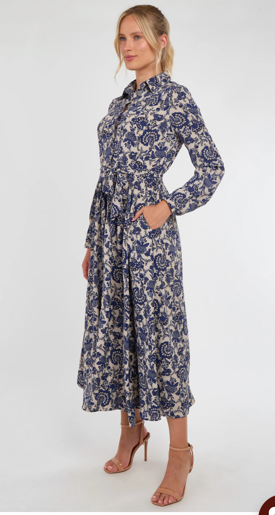 This Navy Floral Vine Print Midi Shirt Dress from Love Sunshine features an elegant navy floral pattern on a soft cream base. It includes a classic shirt collar, button-down front, long sleeves, and a matching fabric belt to define the waist. The flared midi-length skirt and practical side pockets add both movement and function. Ideal for daytime or evening, it can be styled up with heels or dressed down with flats.