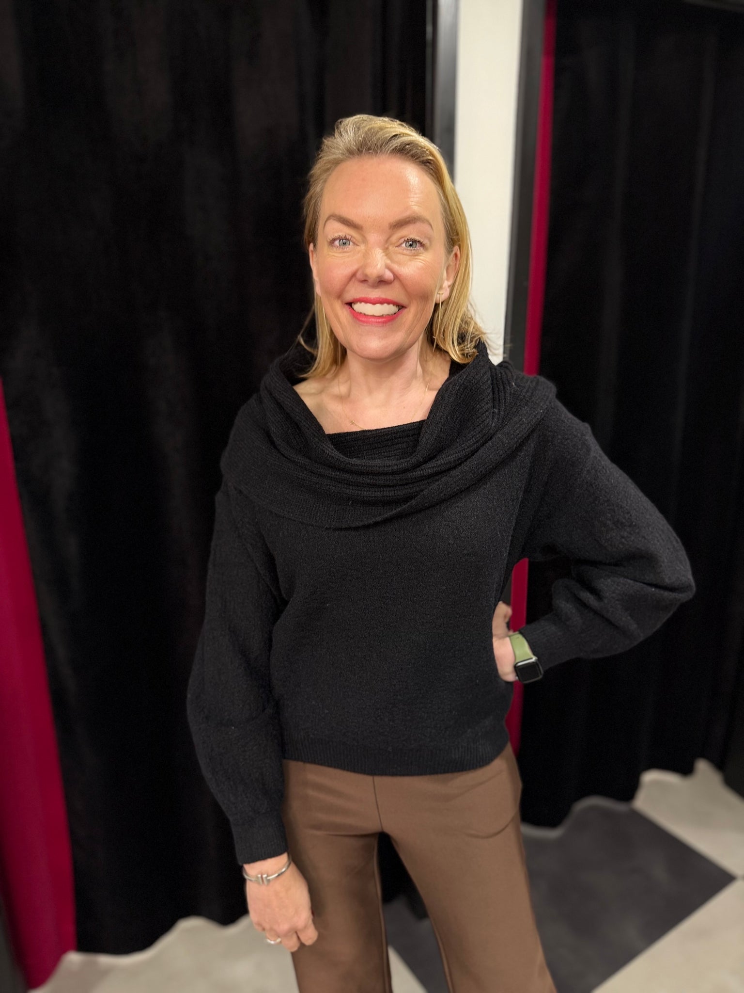 - Chunky rib soft neckline that can be worn on or off the shoulder.