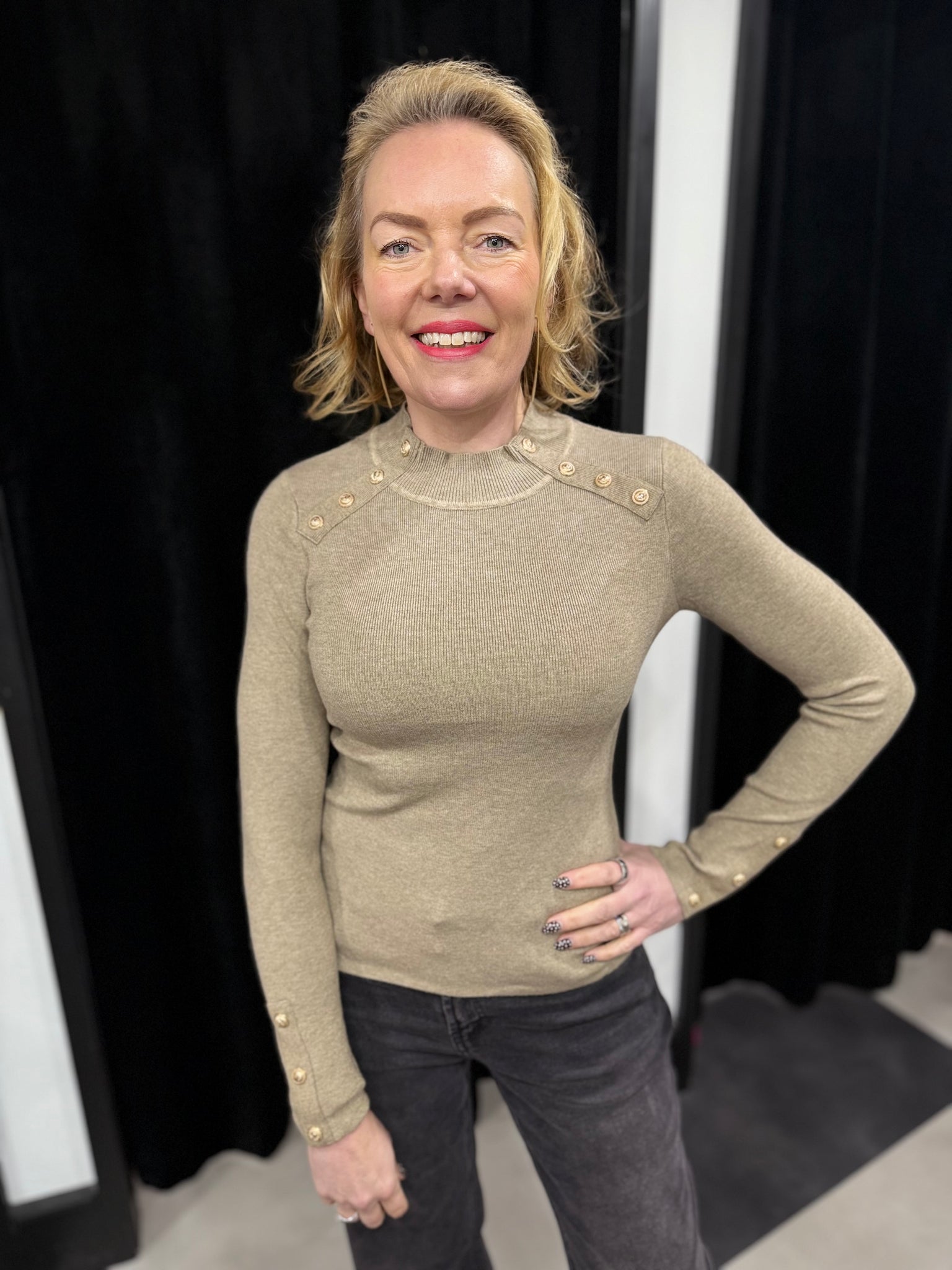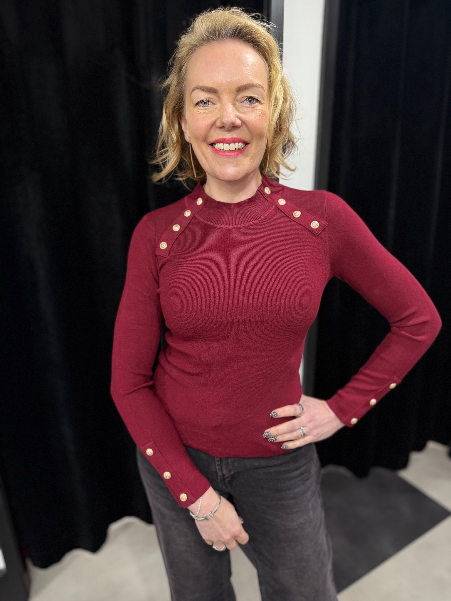 Gold button detail to the neckline and cuffs.