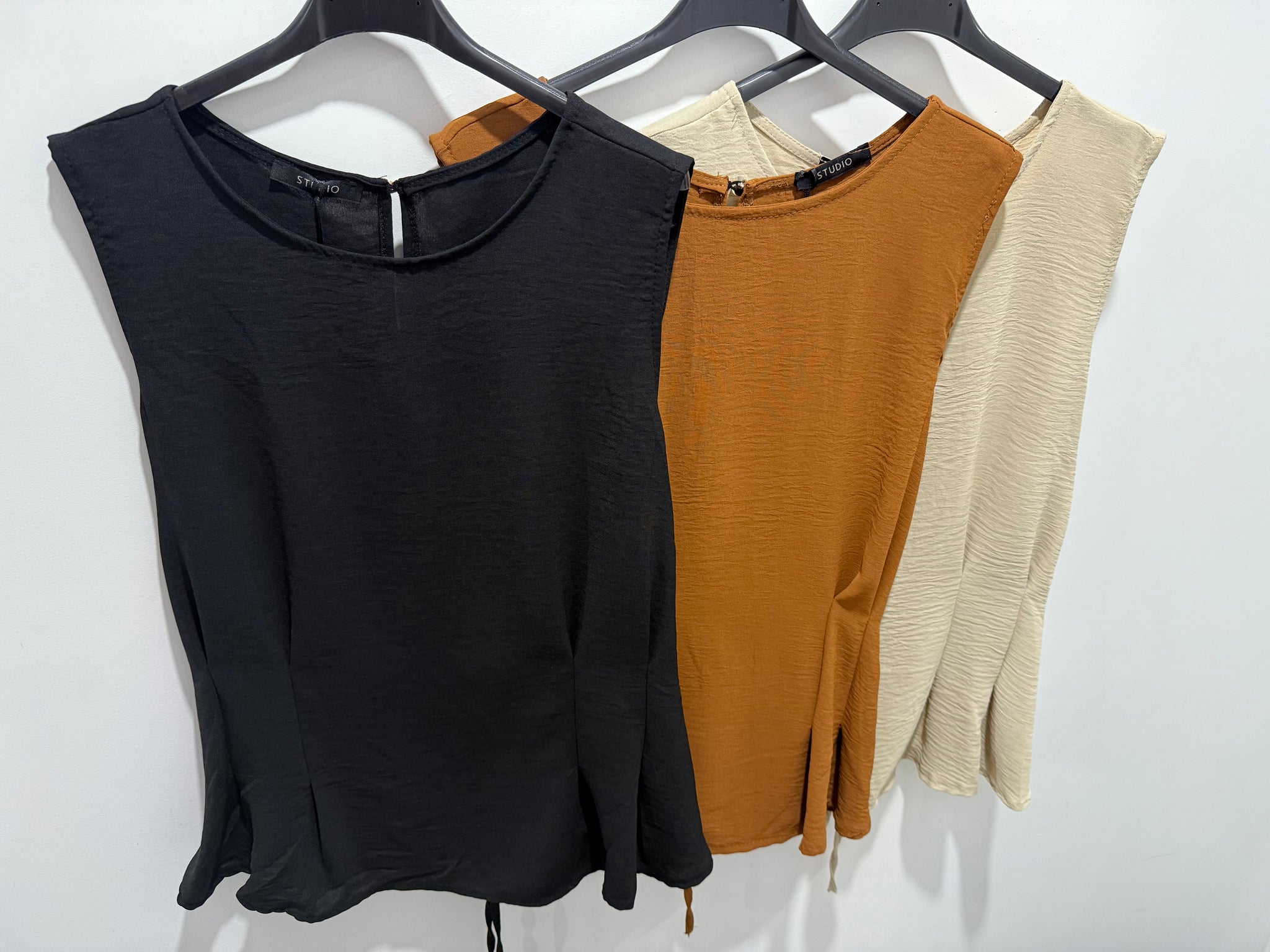 - Cleverly designed new sleeveless top that ties around the back so it is flattering on many sizes and shapes of figure.