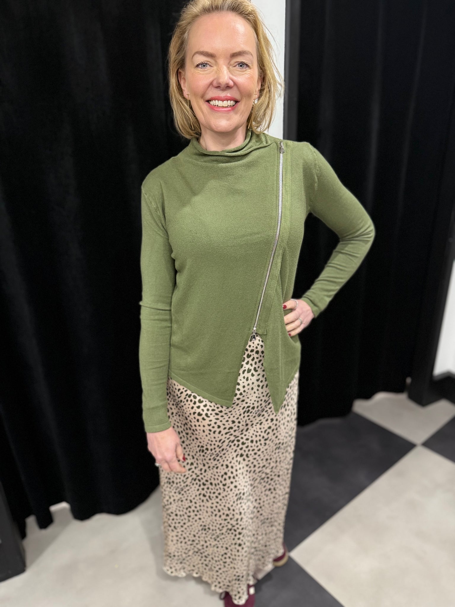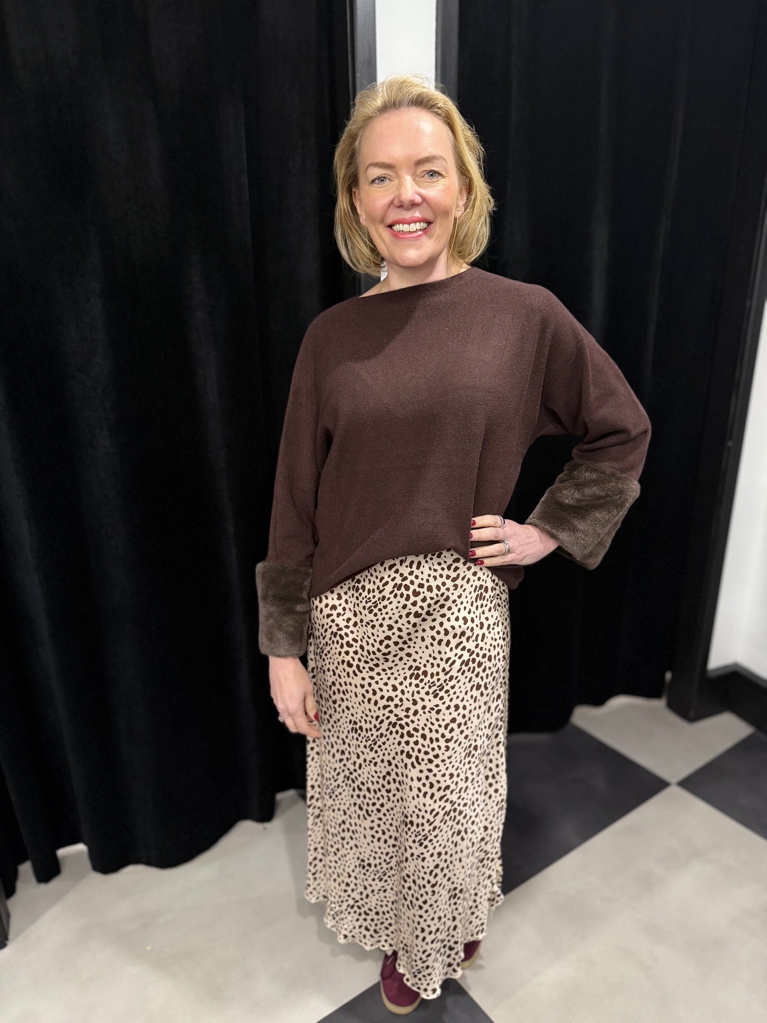 Similar to our other bias skirts but now in mini cow print. It’s a very versatile skirt, can be worn smart or casual.
