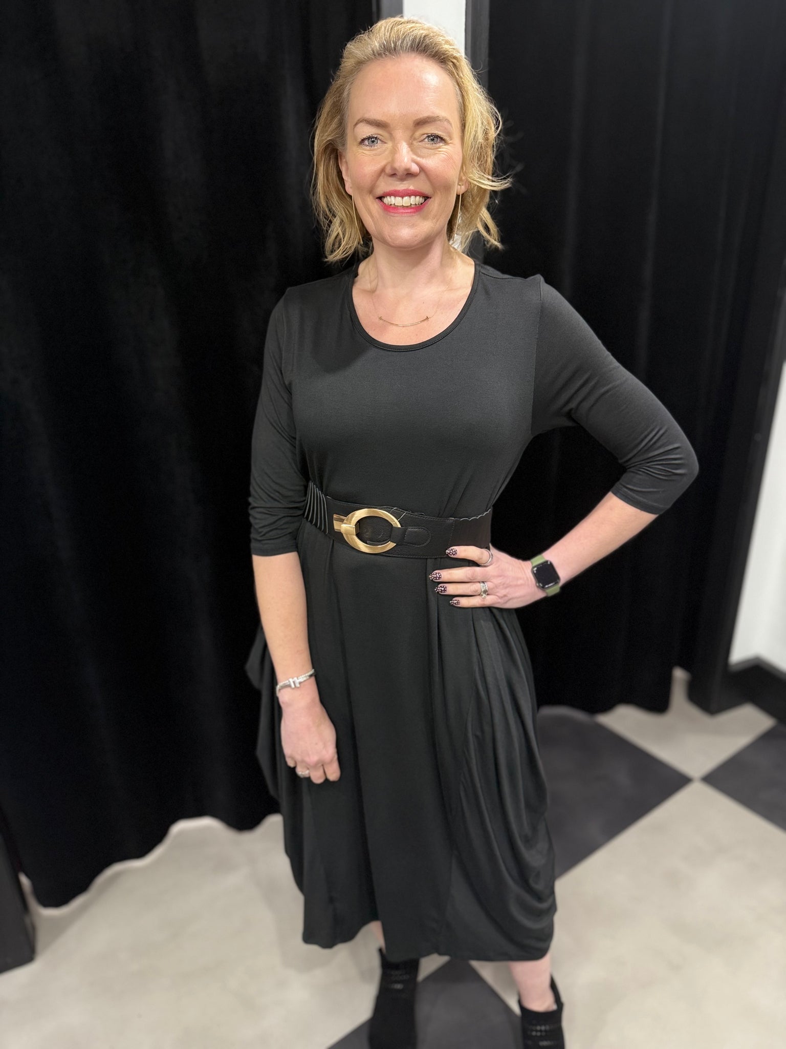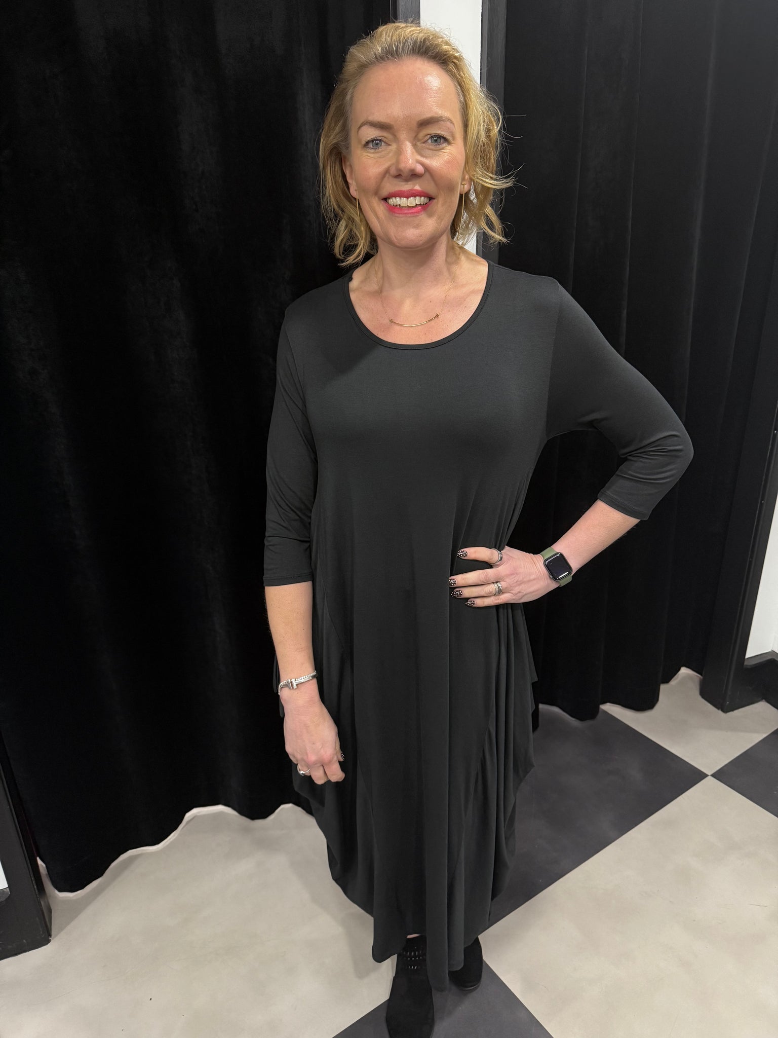Our relaxed style jersey parachute dress is back but now with 3/4 length sleeves. Flattering, comfortable and very versatile it can be worn loose, with a belt, with the side flaps tucked in as pockets or tied together to create a fitted look.