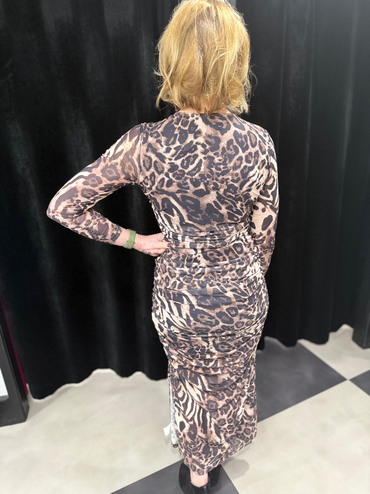 - On trend animal print in tan and black.