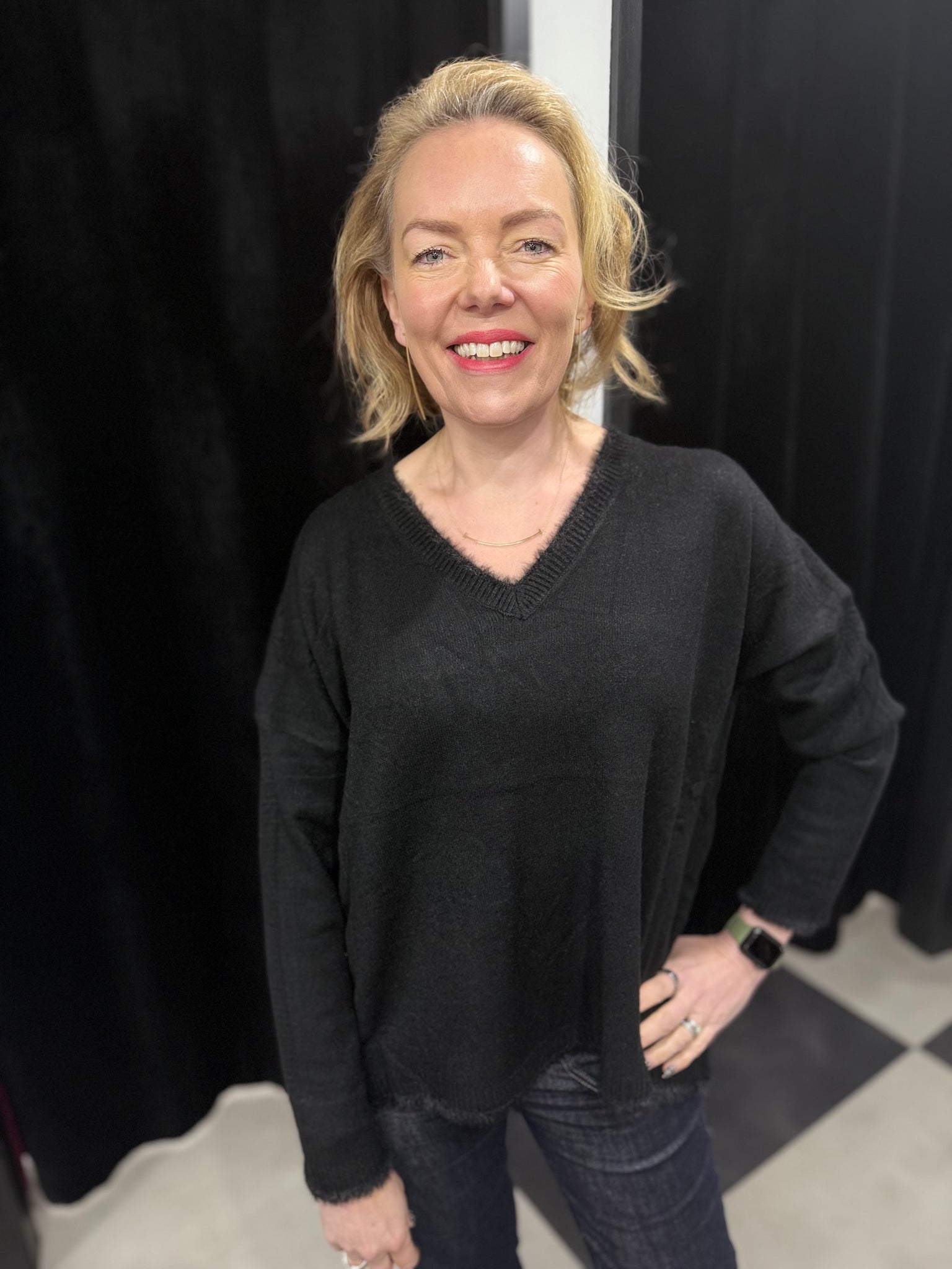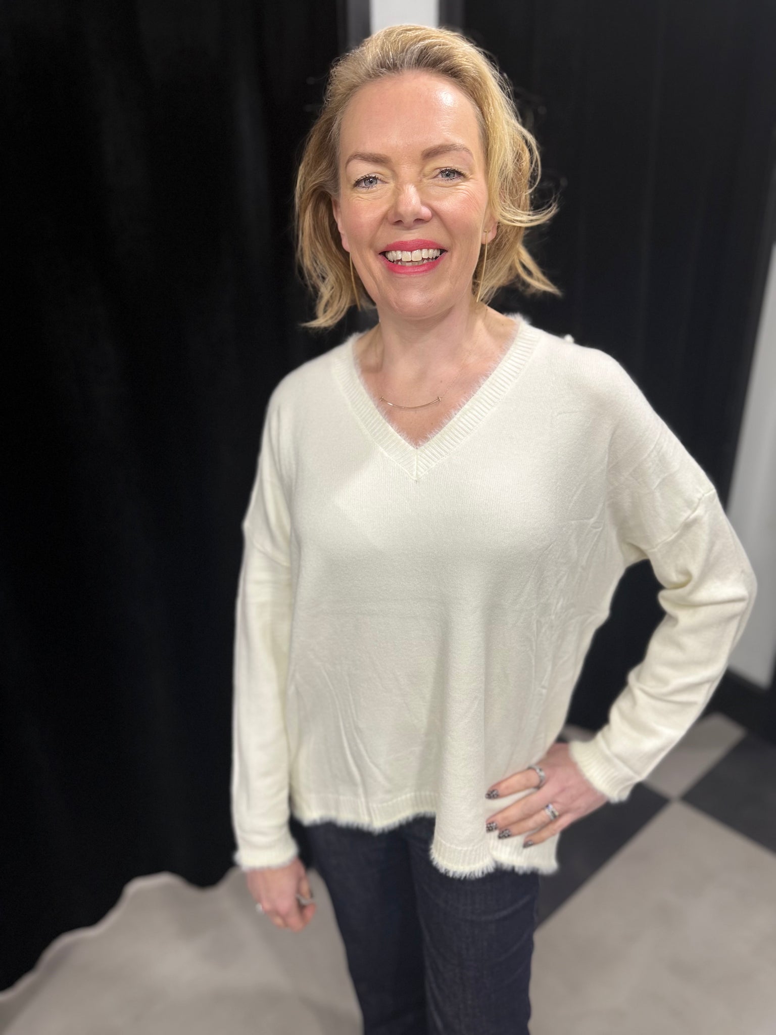 Features a super pretty soft fluffy edging to the neckline, hem and cuffs.
